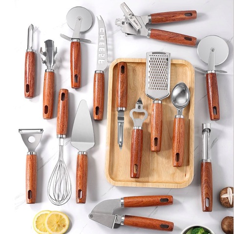 Mango de madera ergonómico de acero inoxidable, accesorios de cocina y horneado, utensilios esenciales, juego de utensilios